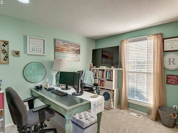 Corner lot across from the neighborhood park/open space. One story, vaulted ceilings & lots of light. Newer roof, siding, windows, updates throughout. 2 bedroom plus office (possible small 3rd bedroom, no closet) Lovely floorpan. Kitchen w/granite, tile & stainless appliances, fridge included. Two sliders to patio spaces, one covered, one open, nice sized yard. Primary bedroom separate from other bedrooms. Interior laundry. This is a must see. Well cared for home.