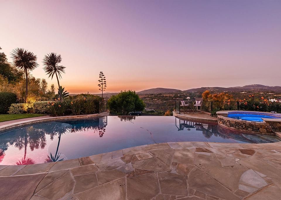 Perched to capture breathtaking views of Rancho Santa Fe, this remarkable estate in the prestigious gated community of The Groves is the epitome of refined luxury living. With only 39 residences in the community, exclusivity and privacy are unmatched. The main residence features five bedrooms and six bathrooms, with all upstairs bedrooms offering en suite baths, plus a spacious bonus room and a gorgeous office with custom cabinetry. A separate 1BR/1BA guest home is a fully functioning unit complete with a kitchenette—ample storage, microwave, a two-burner stovetop, and even a compact dishwasher—offering comfort and independence for visitors. The open floor plan is ideal for modern living and entertaining. The kitchen is a chef’s dream, outfitted with premium Viking appliances, including a built-in refrigerator, an 8-burner commercial-style stove, dual dishwashers, and a warming drawer. From there, the flow continues through elegant living and dining spaces to patios and terraces that frame wide-open views. Upstairs, the primary suite opens to an expansive private terrace through dramatic bi-fold doors. Step outside and experience your own retreat, where sweeping panoramic vistas of the Rancho Santa Fe hills create a setting as tranquil as it is majestic. Set on 1.23 acres of lush grounds, the property includes mature landscaping, an orchard with abundant fruit trees, a lush lawn, and resort-style amenities. An infinity-edge pool and spa, built-in BBQ, outdoor fireplace, and fire pit provide endless opportunities to relax or entertain beneath the California sun. The home also features an oversized four-car garage with a convenient drive-through design—perfect for a car collection, additional storage, or flexible workshop space. The views are truly remarkable. From the backyard to the pool to the terraces above, the estate was designed to embrace the natural beauty of Rancho Santa Fe’s rolling hills from every vantage point. Located just minutes from multiple highly regarded golf courses, fine dining, boutique shopping, and pristine coastal beaches, this estate blends tranquility with accessibility. It also falls within the boundaries of the highly acclaimed Roger Rowe Elementary and Middle schools, consistently top-ranked for academic performance. This home is truly one-of-a-kind—an exclusive retreat that balances timeless elegance with the very best of Rancho Santa Fe living. For those who expect nothing less than extraordinary, this estate delivers.