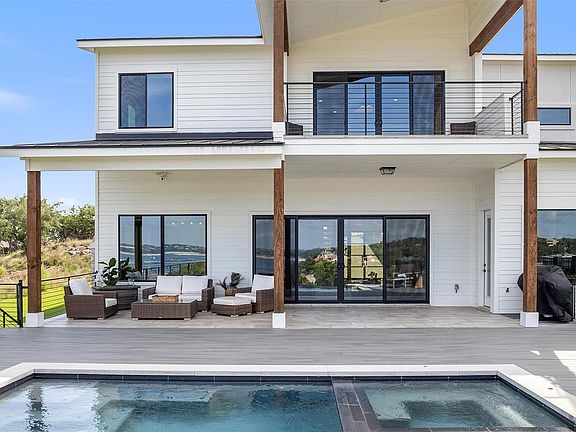Experience the Ultimate in Lakeside Luxury Living at Waterford on Lake Travis. This stunning custom-built estate, nestled within the highly sought-after, gated community of Waterford, offers a resort-style lifestyle with breathtaking views of Lake Travis. Boasting a fully furnished interior, this stunning home sits on an expansive 1.146-acre lot andfeatures a n entertainer's deck, faux infinity pool, great lawn, and a second-floor balcony, all overlooking the majestic Lake Travis. The sleek and modern interior design seamlessly blends natural elements with bright, open spaces and state-of-the-art finishes. The luminous open floor plan encompasses the living room, gourmet chef's kitchen, and formal dining area, all adorned with high ceilings, LVP flooring, walls of windows and custom sliders, ensuring that every room captures the stunning lake views. The chef's kitchen is a culinary masterpiece, featuring an oversized center island, quartz waterfall countertops, breakfast bar, custom cabinets, and top-of-the-line appliances. The luxurious primary retreat, situated on the main floor, offers direct access to the back deck, ensuite bathroom, while a bonus home office provides convenience. Upstairs, a centrally located game room, a covered balcony, 3 guest bedrooms with 2 full guest bathrooms await. The outdoor oasis is an entertainer's dream, with a covered porch, expansive alfresco pool deck, and a lavish faux infinity pool. This property is perfectly positioned for front-row seats to the annual July 4th Fireworks show by Mattress Mack. Stone pathways and a patio with a fire pit, accessible via two sets of stairs on both sides of the deck, create the perfect ambiance for outdoor gatherings. Golf enthusiasts will appreciate the proximity to three nearby courses, while Waterford residents enjoy access to the Waterford Marina. Secure this Lake Travis Luxury Getaway where every summer is a vacation! Contact the Listing Agent to schedule a private showing today.
