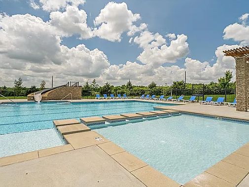 Olympic-size poolCozy fireplaceResort-style amenitiesPlush carpetZero-entry accessFull unfinished basementPeaceful open field