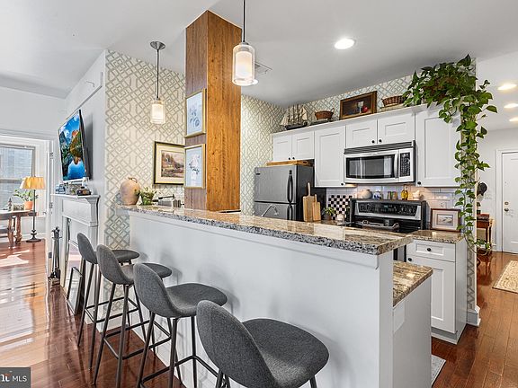 Welcome to the sixth-floor of The Belgravia—an elegant two-bedroom, two-and-a-half bath residence in one of Rittenhouse Square’s most storied buildings. This two corner unit offers a thoughtful layout with two private bedroom suites, each offering space, light, and comfort that make it feel like a home within a home. Step inside to a welcoming entry hallway, complete with a generous half bath and coat closet. Rich dark hardwood floors run throughout, setting a warm tone enhanced by custom wallpaper accents, natural light, and cool city views. Each bedroom suite is positioned on opposite sides of the unit for added privacy. The first, a sunlit corner room with windows facing east and south, boasts exposed red brick, a full en-suite bath, and an in-unit washer and dryer discreetly tucked into a closet. The second suite, also a corner room, features a striking bay window, ample closet space, and an en-suite bathroom with checkerboard tile and bold wallpaper that adds personality and polish. While every corner of this home has its charm, the kitchen feels like the heart of it all—a true command center where functionality and style come together. This cucina is a sturdy, high-performance space, perfect for prepping and cooking. It opens up to a raised countertop (fits 4 stools) with serious real estate- perfect for parking with a laptop and a snack. Cooks will appreciate the flow of the space, while those enjoying an evening movie in the living room will love the SilencePlus dishwasher from Bosch. Residents of The Belgravia enjoy 24-hour doorman service, a fitness center, elevator, secure package delivery, and a bike room- all within a beautifully restored building just steps from Rittenhouse Square. With iconic dining, green space, and cultural institutions just outside the door, this is city living at its best. We can't wait for you to see this apartment.