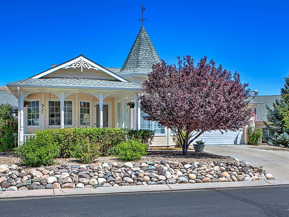 Victorian Estates is a charming 55+ community close to all the amenities both Prescott and Prescott Valley have to offer. The large front porch w/vintage look detailing, even a swing, features a high pitched turret & weather vane. This 'Queen Ann' plan, has beautiful wood-look laminate floors, new carpet in bedrooms, gas log firepl, fluted molding, wood sills. New roof was put on in 2016. 2 Bedroom with den/hobby room makes this a spacious full time residence or getway. Great cabinet storage in 2 car garage. Wide open patio, easy care landscape. View surrounding natural hillside from expanded front porch. Community includes a clubhouse with outdoor pool, activities, billiard room, sauna, spa, exercise equipment, parks and walking trail.