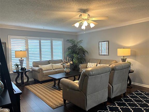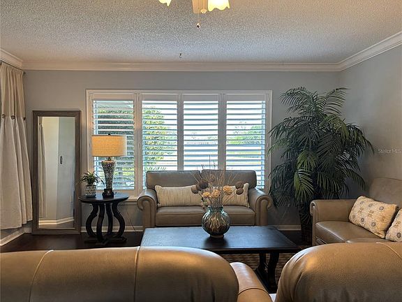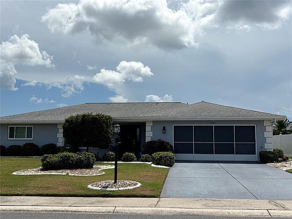 Welcome to 1811 El Rancho Dr, Sun City Center, Florida! This charming home features 2 bedrooms and 2 bathrooms, along with an oversized 2-car garage, all situated in a non-HOA area that permits fencing. Enjoy picturesque views of the pond from your front living room or the screened garage. Home Features - Split Bedrooms - Each equipped with an en-suite bathroom, walk-in shower with a bench, walk-in closet, and a linen closet. Galley Kitchen has updated cabinetry with ample drawers, upper cabinets featuring glass fronts and lighting, built-in oven, and shiplap ceiling. Multifunctional Great Room can serve as a formal dining room or den. Dining Area just beyond the kitchen, leading to double doors (with built-in blinds) that open to a private screened gazebo with a roof. The backyard is fenced to provide a private oasis. The oversized garage allows for longer vehicles or additional storage. The laundry area has a utility tub and cabinets for additional storage. There are impact windows throughout the home, along with drop-down storm shutters on most windows. Crown molding throughout the home adds a touch of elegance. The HVAC system was updated in 2021. Sun City Center is a vibrant 55+ community offering an array of amenities including indoor and outdoor swimming pools, large fitness center, tennis courts, Pickleball, lawn bowling, and softball for both men and women and woodcarving. In addition, there over 200 clubs such as travel, gardening, ceramics, computer, bridge, poker, writing, big band, chorus, jazz, dance clubs, theater groups, and a library. Located just a short drive from Sarasota, St. Petersburg, and Tampa, you'll have access to professional sporting events, cultural activities, and America’s award-winning beaches.