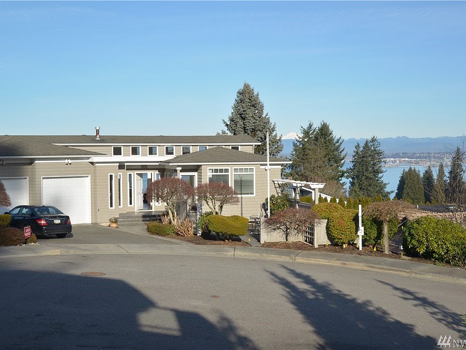 Sun filled custom architect designed view home. Home as been extensively refreshed to "like new" condition. All one level living possible in this open plan view home at the center of desirable cul-de-sac. High quality finishes throughout in excellent condition. Many upgrades throughout. Everything you need on one level. Indoor outdoor living in the kitchen and out to the view deck. Master bedroom and bath share fireplace. Sits above above Harbor View Park with view of the bay.