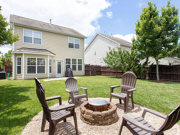 Perfectly situated between Raleigh and Durham you'll find this charming and bright home. Greeted by arched doorways and high ceilings only enhances the gleaming hardwoods which flow through the open floorpan. Anchored by a beautiful fireplace, the living space also extends to outdoor living at its finest. The fenced backyard features space to play or relax with a patio and cozy fire pit ideal for entertaining. Spacious primary bedroom showcases a vaulted ceiling, double walk-in closets, and luxurious updated en suite with dual sinks and a soaking tub. Plenty of storage with a laundry room, 2 car garage, and deep closets throughout. Updates include new (2023) A/C Unit, refrigerator, mailbox (2022) Hot water heater, all new carpet, downstairs hardwood floors, fireplace hearth, primary bath flooring tile, tiled shower, and new shower glass door, (2018) all new interior paint and new dishwasher. Located in a coveted neighborhood with a plethora of amenities while also minutes to Brier Creek, RTP, RDU airport and easy highway access!
