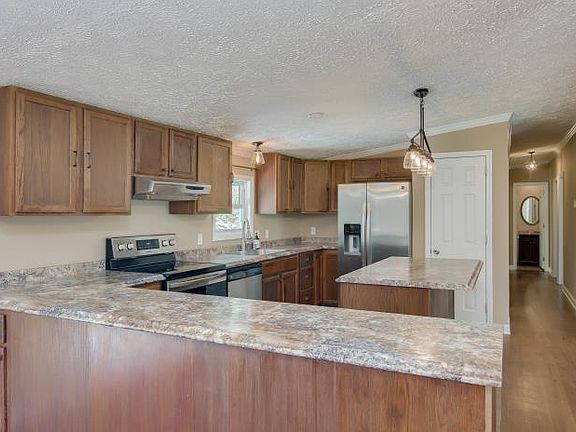 The remaining three bedrooms are situated on the left side of the home, past the well-appointed kitchen. The heart of the home, the kitchen, is a true culinary haven, featuring modern stainless steel appliances that blend seamlessly with the beautifully contrasting pine flooring. The blend of elegance and practicality continues with ceramic tile in the bathrooms and kitchen areas, making maintenance a breeze.