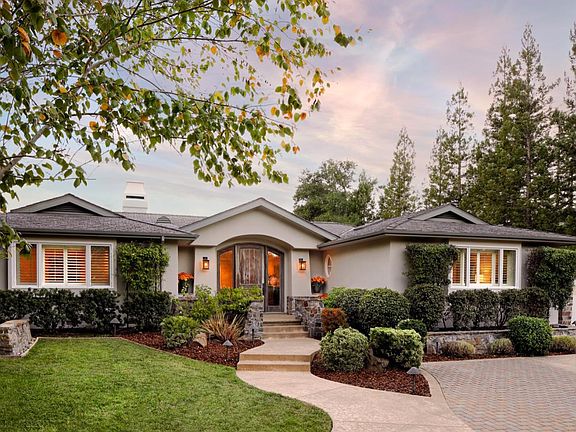 Idyllic indoor-outdoor Monte Sereno living with spectacular backyard. Ideal for entertaining on a grand scale or hosting casual pool parties/BBQs. Over 1 acre, primarily flat lot on quiet cul-de-sac. Gorgeous, panoramic hill views. Open concept kitchen-family great room with large breakfast area overlooking property. Home theater/game room with bar and wine closet. Wonderful primarily 1-level floorplan with 4 of 5 bedrooms en suite. Spa-like primary suite with romantic fireplace, naturally bright shower enclosure, deep-soaking tub, walk-in closet and two walk-out patios. Large pool and spa, outdoor fireplace, outdoor kitchen. Expansive backyard includes spacious lawn, sport court, bocce ball court, putting green, and a vineyard. Solar system for home. 3-car garage with extra large driveway for guests.