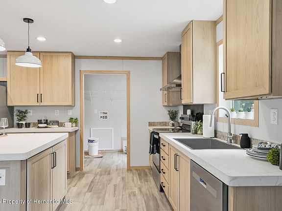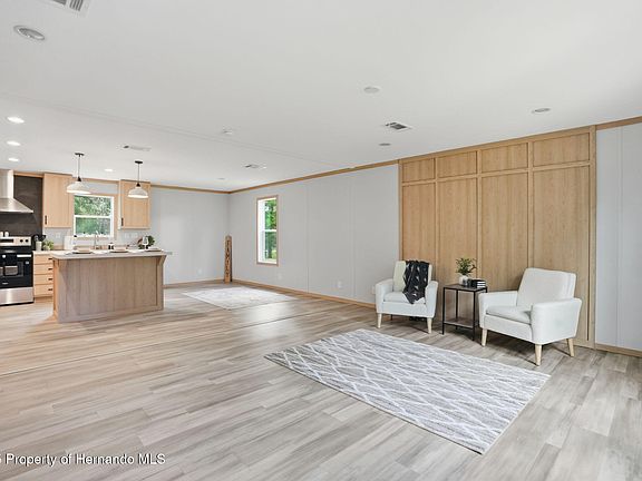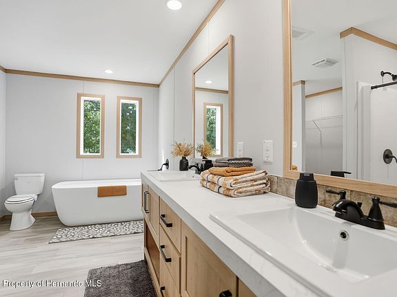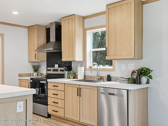 MOVE-IN READY!! BRAND NEW PALM HARBOR HOME!! 3 Bedrooms + 2 Bathrooms + STUNNING PRIMARY SUITE with Freestanding Soaker Tub, over 1/4 acre CORNER lot + on a paved road with Beautiful Mature Oak Trees and NO HOA and NO LOT RENT!! You own the land!! Everything is NEW!! This stunning brand-new, well-built, double-wide Palm Harbor manufactured home has a full finished drywall interior, 2 x 6 (not 2 x 4) exterior framing with triple studs at all exterior openings, 2 x 8 floor joists; feel the difference when you walk inside! Even the skirting on the home meets the highest standards of quality constructed of solid cement board. The home sits on .29 of an acre of beautifully landscaped land in peaceful Brooksville — and best of all, NO HOA...so bring your boat, camper, ATV, pets, bring it all! Boasting 1,440 sq ft of thoughtfully designed living space in the new warm earth tones, this home offers a large open floorplan with the kitchen open to the dining room and great room making this home feel incredibly spacious, light, bright, and cheery. Great for entertaining family and friends!! The home is loaded with upgrades, including luxury vinyl plank flooring throughout (no carpet), making it as stylish as it is low-maintenance. Even the skirting on the home is the Step into the designer kitchen, where no detail has been overlooked. You'll love the expansive center island with breakfast bar, perfect for extra seating!! The kitchen features all-new stainless steel appliances, with an extra upgraded range hood with designer backsplash (the focal point of the kitchen), real wood shaker cabinets, gorgeous modern countertops, and designer lighting, sink, and faucets. Lots of beautiful countertop space and lots of cabinets for plenty of storage! The primary suite is a true retreat, featuring a spacious bedroom and a luxury en-suite bathroom you rarely see --- with a STUNNING modern standalone soaking tub, separate walk-in shower, dual designer sinks, and beautiful accent windows over the soaking tub that give the space an upscale, spa-like feel. This master bathroom is super spacious and truly an impressive upgrade for the home!! You'll want to show this off to your guests!! The second bathroom has a tub and shower combo with matching finishes giving that continuous feel throughout the home!! The 2nd and 3rd bedrooms are both a good size!! Everything in this home is BRAND NEW: new well, new septic with 2-year maintenance warranty, new HVAC, all new appliances, new water heater, and the home is covered by a 1-year manufacturer's warranty! Enjoy the peacefulness of the surrounding area, adorned with the iconic large live oak trees that Brooksville is known for. And when it's time to run errands or commute, you're just minutes from groceries, shopping, restaurants, and the Suncoast Parkway for easy access to Tampa and beyond. 30 minutes to sunsets at Pine Island, Buccaneer Bay Water Park, kayaking and paddle-boarding the crystal clear Weeki Wachee River, swimming with the manatees, boating and fishing in the Gulf of America! 40 minutes to Tampa for work and play!! Don't miss this rare opportunity to own a move-in ready home on land with all the benefits of new construction — and none of the restrictions! Schedule your private showing today and start living the Florida lifestyle you've been dreaming of!