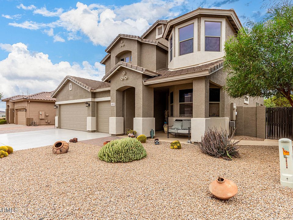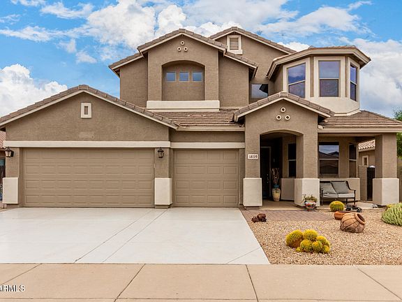 This fabulous 2-story, 5-bedroom property is the one for you! Be welcomed by a 3-car garage, RV gate, lovely desert landscape, & a relaxing front porch. Inside, discover a welcoming living room showcasing tile flooring, high ceilings, & a bar. The spacious great room enjoys sliding doors to the backyard, making it the ideal place for entertaining. The loft provides enough space for a media room. The kitchen provides durable counters, wood cabinets, pantry, & built-in appliances. The main bedroom boasts a sitting area & an ensuite w/dual sinks, separate shower & tub, and a walk-in closet. Host fun memories in the spacious backyard complete with a cozy covered patio, sparkling swimming pool, RV parking, & seating area w/ fire pit. Furniture to be sold with home. This is a must see home.
