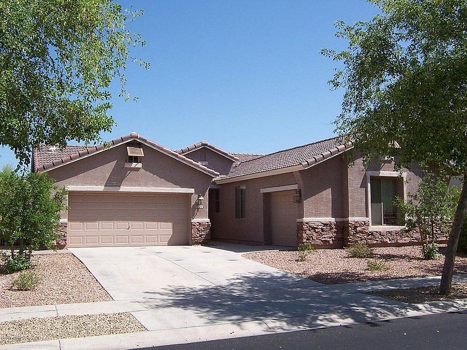 Beautiful single-level home with a pool in a quiet, gated community. With three bedrooms plus office, two full baths, 9' ceilings, it features a huge great room, new paint throughout the home, ceramic tile, light-filled windows, and 3 car extended-length garages. Great room includes entertainment center with surround sound. Step into the back yard to enjoy an extended covered patio, self-cleaning pebble tech pool, and a delightful waterfall. Spacious master BR with a bay window and automatic (motorized) blackout interior shades that you can open to let the light in or close to make it completely dark. Master bath has raised double sinks, separate tub and shower, and walk-in closet. Water Softener. Two zone A/C and heating units. Owner pays for weekly pool maintenance.