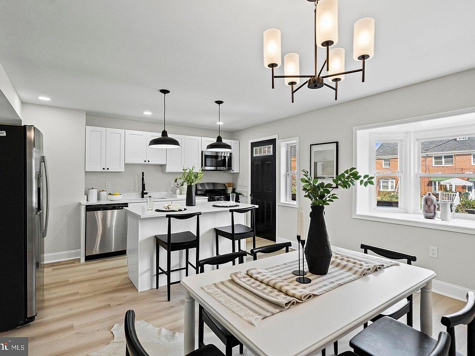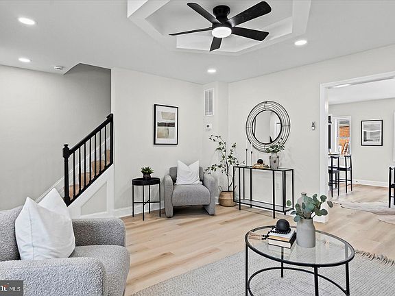Beautifully renovated 5BR/2BA Townhome located on a quiet tree lined street, conveniently located near Morgan State University. Make your way to the covered front porch and open the door into your forever home. The main floor living space is boasting with tons of natural light, a soft color palette, luxury flooring, recessed lighting, and an open floor plan. The spacious living room features a custom ceiling design with a ceiling fan and offers a view into the open concept kitchen and dining room. The kitchen features plenty of cabinets, stainless steel appliances, sleek quartz countertops, a deep stainless sink, and an island with pendant lights and breakfast seating. On the second floor you'll find 3 very spacious bedrooms, and a newly renovated and beautifully tiled full bath. There is a massive additional bedroom on the third floor featuring a walk-in closet. The lower level is fully finished, newly carpeted and features the fifth bedroom, a full bath with a walk-in tiled shower, a large family room, storage, a washer & dryer hookups, and a walk-out to the yard. From the kitchen step out onto the balcony and follow the steps leading you down to your new cozy yard space with a walkway taking you to your own parking pad. This home has so much to offer any new homeowner and is conveniently located in close proximity to shopping, restaurants, universities, and commuter routes. Come see it today!