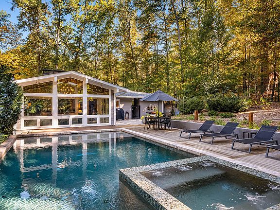 Experience the epitome of luxury living with this extraordinary Mid-Century Modern home located in the picturesque Lake Forest neighborhood of Chapel Hill. This stunning residence has been meticulously renovated by reknown architect Bill Waddell and offers the perfect blend of modern amenities and timeless design, creating an exquisite oasis for those seeking a sophisticated lifestyle. Step outside to find a custom-built pool that boasts travertine borders and decorative glass trim. Designed for year-round enjoyment, the heated pool features a swim jet and sun shelf, complemented by a heated spa. Multiple outdoor entertainment areas, including a private courtyard, a cozy fire pit, and a primary bedroom balcony all tied together with decks made from Brazilian Ipe wood. Inside, the home exudes elegance with walnut hardwood floors, oversized windows, high ceilings, and skylights that bathe the space in natural light. The two wood burning fireplaces, each with distinct chimneys, provide warmth and charm to both the dining and living rooms. Culinary enthusiasts will revel in the chef's kitchen, equipped with stainless steel appliances, brushed silver hardware, a solid walnut block island surface, and granite countertops. The sunroom, transformed from a screened porch in 2018, presents a wall of windows offering breathtaking views of the gardens, custom-built stone walls, and the serene pool. Privacy is paramount with a fenced yard featuring an outbuilding complete with electrical power and a humidifier. Whole house generator, tankless water heater, updated roof. Walk! To shops, restaurants and all the best markets. Walk to the award winning library. Walk to elementary and middle schools. Attend top rated East Chapel Hill HS. Connect to the stunning Chapel Hill trail system Enjoy full membership to the exclusive Lake Forest Association.. This membership grants access to swimming, non-motorized boating, and entertainment privileges at the main beach, enhancing the allure of this remarkable property. Don't miss the opportunity to own this one-of-a-kind home, where every detail has been thoughtfully crafted for luxurious living.