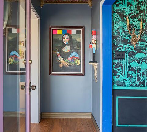 Hidden at the end of a quiet Mid-City cul-de-sac, 1812 S. Dunsmuir feels like an artist's retreat in the middle of Los Angeles. This cobalt-blue sanctuary offers 3 bedrooms, 4 baths, and over 2,300 square feet of effortlessly eclectic living where creativity, comfort, and design converge. Natural light fills the main level's airy living room, complete with high ceilings, fireplace, and city views that stretch into the distance. The eclectic dining room radiates sophistication, flowing into a remodeled kitchen with stainless steel cabinetry, new Smeg 5 burner Range with modern appliances and thoughtful details showcasing a love for cooking. Completing the upper floor are two en-suite bedrooms each framed with Shoji closet doors which provide serene symmetry, joined by a moody powder room with vintage inspired clawfoot tub and beautiful art deco wall paper. Downstairs, the expansive primary suite feels like your own hideaway, bold, bohemian, and tranquil with Moroccan-inspired textures and direct access from the garage. Outdoors, the property truly shines: dine beneath string lights on the private patio, unwind in the new jacuzzi under the stars, harvest herbs from your garden, or work in the most charming bonus office/workout space you'll ever see. And yes, on a clear night, you can even spot the Hollywood sign. Complete with new roof, flooring, jacuzzi, tankless water heater, HVAC and more, this home offers both style and substance. Located minutes from Culver City, the Westside, DTLA, and the beach, this home delivers the Eastside vibe you love, right in the heart of LA.