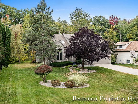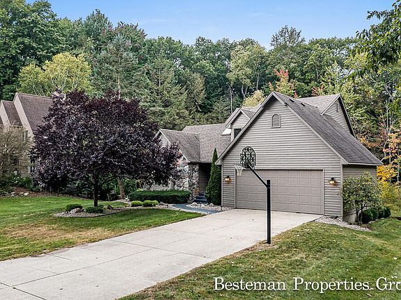Nestled in the serene beauty of Spring Lake Township, this beautiful two-story home with walk-out basement offers traditional touches with contemporary luxury. Situated just steps away from Spring Lake, this four-bedroom, 3 1/2 bath home is set apart with its fantastic layout and gorgeous architecture. The spacious 1440 sq ft main floor boasts wood floors, soaring ceilings, an abundance of light, open kitchen with snack bar, main floor laundry and serene back yard views. The main floor primary bedroom with 2 walk-in closets is a true retreat, complete with a spa-like en-suite bath featuring a soaking tub, a separate double shower, and dual vanities. Three additional spacious bedrooms, office, and walk-out basement offer ample space for family or guests.