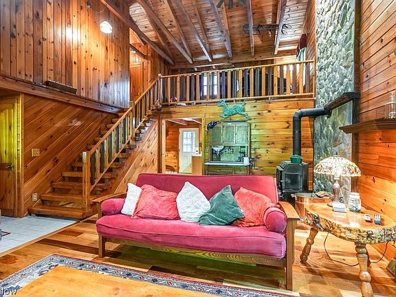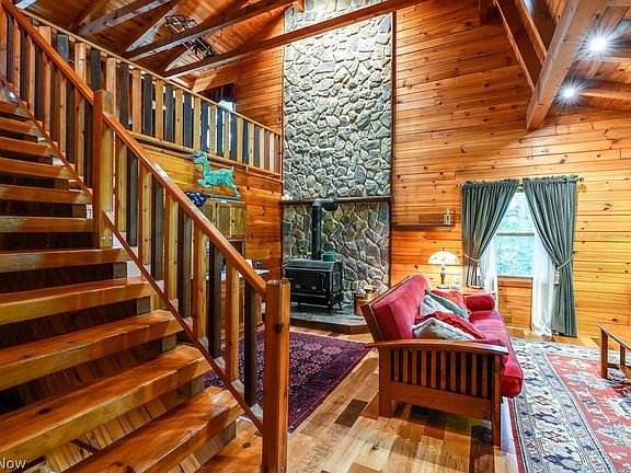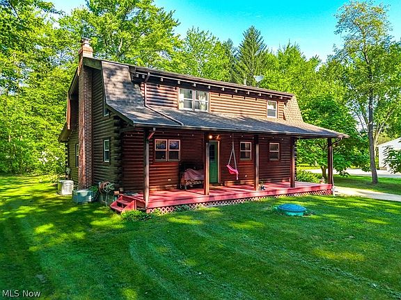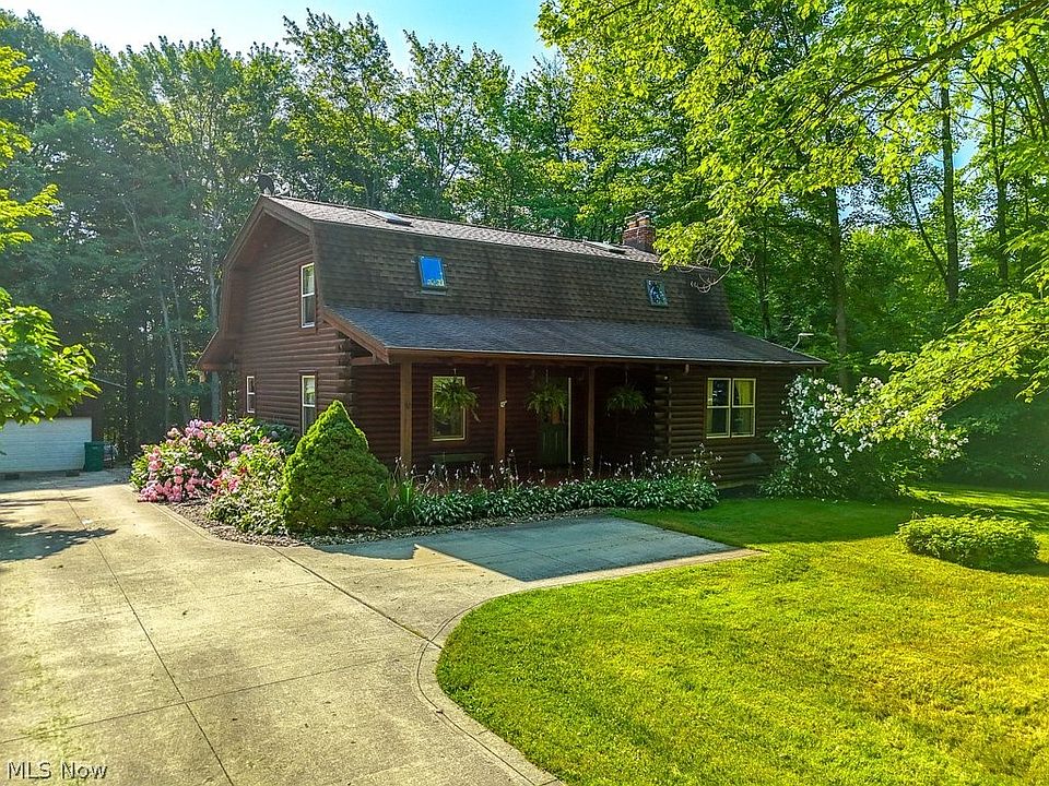 Welcome to this absolutely charming Log Cabin home just minutes away from the award winning Kenston Schools. Enter through the covered front porch into the large great room with vaulted ceilings, wood floors, an amazing wood burning stove fireplace with a custom 2 story stone wall. A large eat in kitchen has wonderful wood cabinetry, lots of counter space and room for a large dining room table. The first floor bedroom has private access to the first floor full bath with sitting tub. Walk up the open staircase to the second floor loft with skylights overlooking the great room welcoming lots of light. The second floor master bedroom has a custom walk in closet, and a large updated glamour bath with spectacular custom stone shower and tile. An unfinished lower level is perfect for you to put your finishing touches. walk out to the covered rear porch to a private, peaceful backyard. This home is situated on a private 2.83 acres with beautiful custom landscaping, and retaining wall with built in lighting . The detached 2 car garage offers conduit lines for gas, water and internet. And a whole house generator.