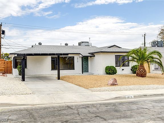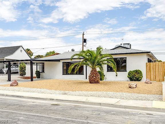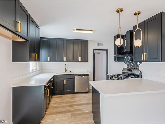 Located less than 10 minutes from the entertainment, shopping and casinos of Downtown Las Vegas! This beautifully remodeled, single-story, no HOA, 4-bedroom home with carport and attached covered patio in spacious backyard! Customary kitchen with a garden view, custom cabinet with gold hardware, tiled backsplash, new countertops, stainless steel appliances and breakfast bar with sitting area. Modern upgraded bathrooms that include custom vanities with gold framed mirrors, lighting, hexagon tiled flooring, modern tiled showers with rainfall shower heads! Gorgeous interior finishes with modern light fixtures, laminate wood flooring and carpet throughout.