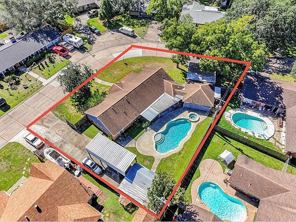 Fully renovated in 2021, this beautiful home is set on an expansive corner lot downtown. The home’s dual driveways offer options—one leading to a carport and detached two-car garage, the other to a gated parking for a boat and RV. Inside, a stunning kitchen steals the scene with granite surfaces, a custom island with a cooktop, pot filler, ambient under-lighting, and fine cabinetry. A den unfolds under high ceilings, with laminated floors and a gas fireplace adding warmth and texture, while large windows frame views of the backyard. Out back, enjoy a heated saltwater pool and spa, a large covered patio, and kitchenette—a lovely setting for both quiet afternoons and lively gatherings. The primary suite has a sitting area, dual sink vanity, jetted tub and updated shower, while a flexible front room serves easily as a study or creative space. With barn doors throughout, this home offers a fresh take on classic Alvin living—modern comfort woven into a setting rich with local charm.