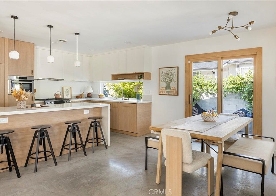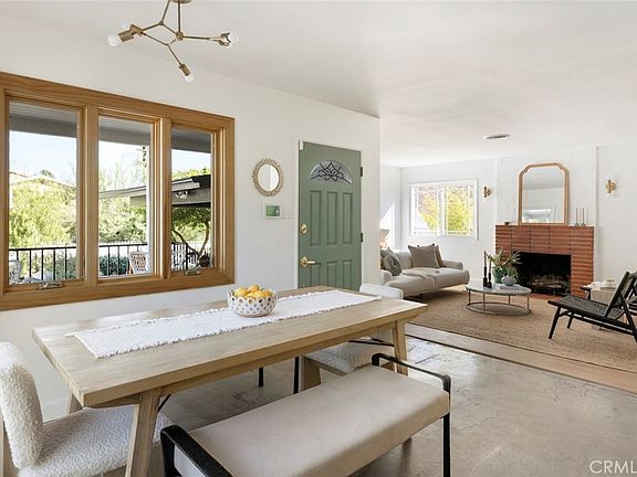 Step inside to an open-concept layout featuring a remodeled kitchen with quartz counters, high-end appliances, and sleek concrete floors that flow seamlessly into the dining area. Sliding glass doors open to a shaded patio with a retractable awning—perfect for indoor-outdoor entertaining. Adjacent to the dining area, the living room centers around a gas fireplace, with brand-new floors running throughout the home for a cohesive, contemporary feel.