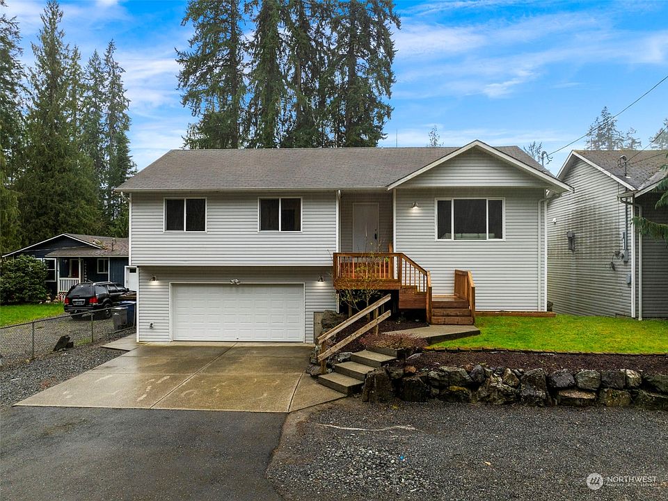Fantastic mid-level entry home on large, level fenced lot. Boasting an open concept floorplan and tasteful finishes, this home is perfect for both comfortable living and entertaining guests. The adjacent dining room provides seamless access to a covered rear deck, with stairs leading down to the expansive yard, outdoor enjoyment is just steps away. Enjoy the primary bedroom with en suite full bath and walk in closet. Two additional bedrooms on the main level, a full bath and utility room add to the home's functionality and practicality. The hidden gem of this property is the spacious oversized 2-car attached garage, complete with an additional 558 sqf storage/shop space, and a convenient 3/4 bath. Overflow parking and NO HOA.