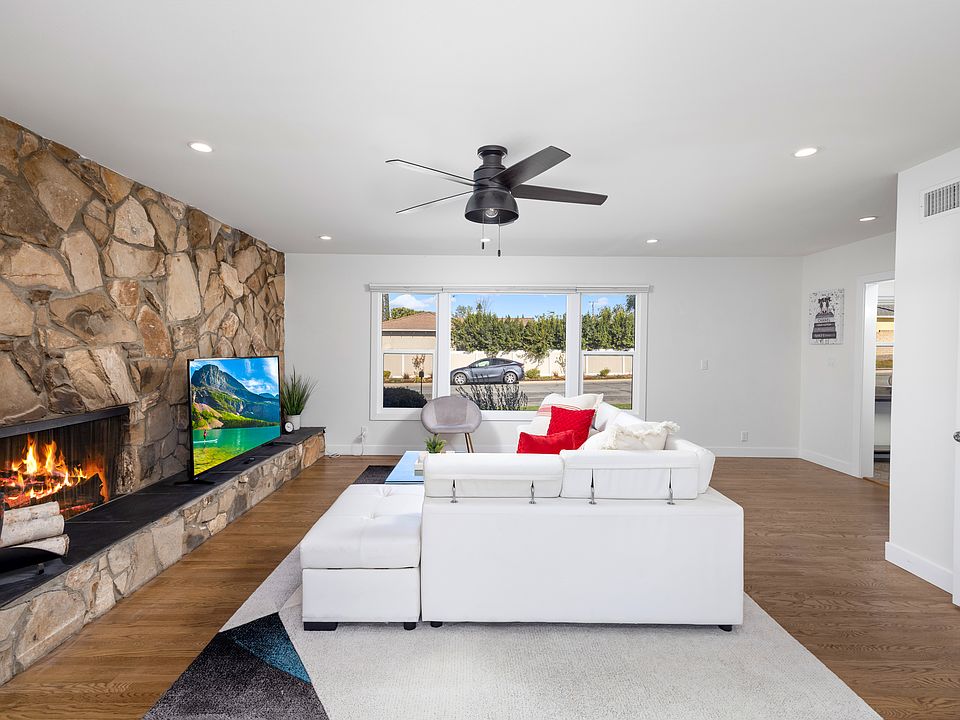 Spacious space with very comfortable premium leather couch that could also be pulled out with a 65 inch SMART TV, full size horizontal art canvas, and a stylish LED strip light.