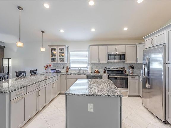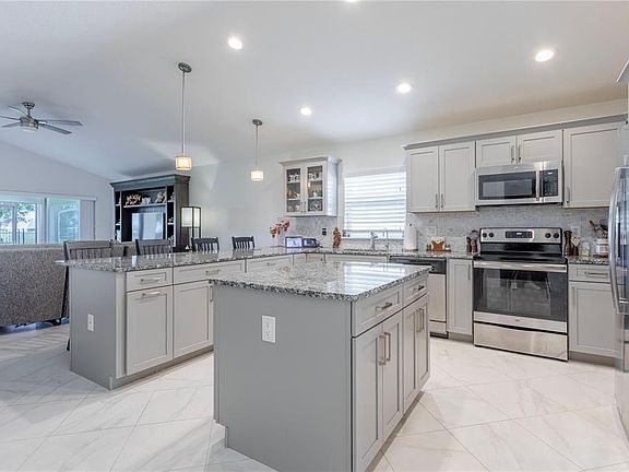 Back screened lanaiKitchen islandBreakfast barGranite counter topsOpen concept family roomPorcelain floorsTile roof