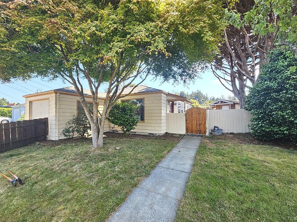 A charming refurbished and solid home with newly refinished hardwood oak flooring in the large living room, a warm woodstove and forced air heating, new bedroom carpet, fresh paint inside and out and new double pane windows. and newly insulated floors! The kitchen and bathroom are nicely lit with skylights. Tile kitchen counters, freshly painted cabinets inside and out with new knobs. The yard is fenced with brand new fencing, and there's a nice patio and solid shed outbuilding. Move in ready ! Enjoy the pride of home-ownership in this affordable classic abode, with all the maintenance work completed, so you don't have to!