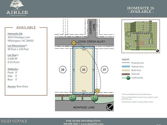 Luxury custom home living awaits in Airlie at Wrightsville Sound! Nestled off of the historic byway of Airlie Road, build your dream home 1-mile from Wrightsville, across from Airlie Gardens, and enjoy all of the incredible amenities that Wilmington has to offer! Lot 26 is a rear alley lot nestled within the heart of the community. Discover your opportunity to build today!