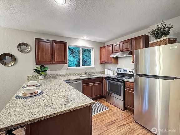 Your dream home awaits! This stunning 3BD/2BA + loft/den split-level offers 1,890 sq ft of stylish living. Recent updates include new carpet in bedrooms (2025), Hardy Board siding & windows (2019), furnace (2019) & water heater (2023) for peace of mind. The loft is ideal for a home office, while the kitchen shines with SS appliances, granite counters & a huge eat-up bar—an entertainer’s dream! Gather around the cozy wood-burning fireplace, relax in the upper-level bath w/ custom tile & dual access from hall & primary, or enjoy the 2nd updated bath off the spacious lower-level family room & 3rd bedroom. Step outside to a private backyard oasis with paver patio. Close to schools, shopping, Boeing & freeways—bright, modern & move-in ready!