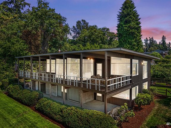 First time on the market in 50 years! This Frank Lloyd Wright inspired architectural design will leave you swooning! Featuring floor to ceiling windows w/views of the sound, islands, & Olympic mountains. Newly painted kitchen offers breakfast bar with easy access to the expansive wrap around deck. Home offers 5 bds, 2 baths, 3,056 sq ft, A/C, & open concept kitchen & living space. Home features 16 30ft hand hewn beams, knotty pine ceilings, & white oak hardwoods. Double sided gas fireplace, reading nook, closet built-ins, plenty of storage, spacious laundry, & attached 2-car garage. The large well-manicured lot is a secluded oasis. New fence surrounding the property, enjoy the peaceful wildlife visits, and serene atmosphere.