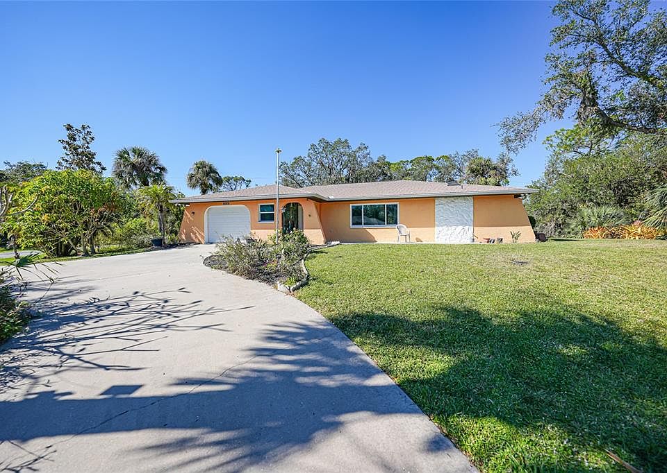 This rare opportunity offers a nicely maintained pool home nestled on a corner lot, set on one acre of beautifully landscaped grounds, creating a peaceful, park-like retreat. Surrounded by stone walkways, charming seating areas, winding pathways, a cozy fire pit, towering oak trees, and vibrant flowers, this outdoor oasis invites you to relax and immerse yourself in the beauty of nature. Inside, the home features 1,651 square feet of living space, including 3 bedrooms, 2 bathrooms, and an attached garage with laundry area. Enter through the spacious living/dining room, where luxury vinyl flooring flows seamlessly throughout the living spaces, complemented by high ceilings that add to the home’s airy feel. Sliders in the dining room open to the expansive lanai and pool area, creating an ideal space for indoor-outdoor living. The kitchen is a chef’s dream, with plentiful cabinetry, a large walk-in pantry, stainless steel appliances, a stylish tiled backsplash, and durable laminate countertops. A generous dinette area, complete with a built-in serving counter and additional storage, offers the perfect spot for enjoying your morning coffee. The master suite is a private retreat, featuring his and hers closets and dual vanities in the master bath for added convenience and comfort. The split-bedroom layout also includes a large second bedroom with a walk-in closet, along with a versatile office or study that could easily serve as a third bedroom. Additional living space is found in the converted one-and-a-half-car garage, offering more flexibility to suit your needs. The spacious lanai, with stamped concrete designed to resemble stone, is ideal for outdoor living, providing spectacular views of the lush landscaping. The salt water, heated pool has a new pool cage in 2022. Home also features new roof in 2022, hurricane windows and screens, A/C is 2009, water heater is 2017 and appliances 2018 (Microwave 2024). Situated in Port Charlotte, Florida, this home provides easy access to a variety of amenities, including shopping centers, dining options, parks, and recreational activities. Enjoy the renowned Florida lifestyle with nearby beaches, boating, and fishing opportunities, ensuring that you are never far from the area's natural beauty.