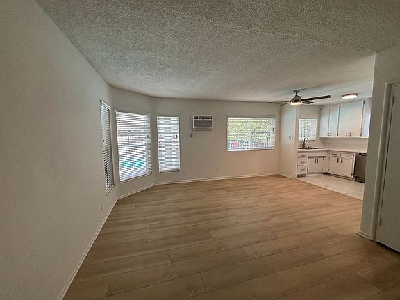 Spacious living room and dining area with wood flooring and fresh paint throughout. Features include a wall A/C unit, wall gas heater controlled by a digital thermostat, a modern ceiling fan with light on a dimmer switch, large double-pane windows with vertical blinds.