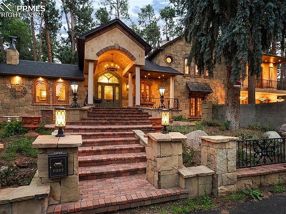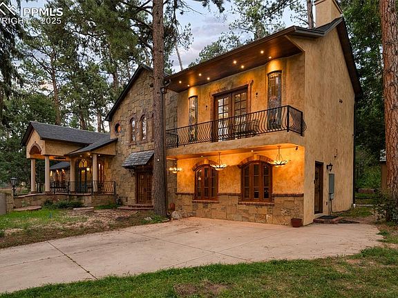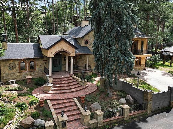 Rare opportunity to own a one-of-a-kind custom Tuscan-inspired home, rebuilt from the foundation up in 2018 after being purchased in 2014. Used as a successful turnkey vacation rental, this remarkable property showcases upgraded features, quality craftsmanship, and timeless character throughout. Perfectly situated within walking distance to the 5-star Broadmoor Hotel and open park space, the home offers a quiet, secluded setting surrounded by mature pine trees and natural habitat teeming with wildlife. The impressive leaded glass front door opens to a warm welcome, where a stunning chandelier, brick-lined ceiling supported by grand columns, arched windows, and wrought iron and leaded glass accents set the tone for elegance. The formal dining room features a fireplace and generous space for large gatherings, while the expansive gourmet chef’s kitchen is a showpiece with professional-grade appliances, an 8-burner gas range with griddle, a copper apron sink detailed with grapevine accents, Rocky Mountain granite backsplash, and a wine refrigerator. The inviting living room offers a second fireplace, built-in shelving, and abundant natural light. Upstairs, the primary retreat occupies the entire 1,119 sq. ft. level—a serene sanctuary with a spacious sitting area, two fireplaces, French doors to a private balcony, a wine refrigerator, and a one-of-a-kind rock-cut sink. The luxurious en-suite features a double-sized jetted tub and a massive walk-in spa shower. Outdoors, the private backyard offers multiple spaces for relaxation and entertaining, all framed by the home’s peaceful, natural surroundings. Additional highlights include a tankless water heater and thoughtful design elements throughout. Plenty of off-street parking and there are building plans to add a garage if desired. This is a rare chance to own a truly unique, secluded luxury home just steps from world-class amenities.