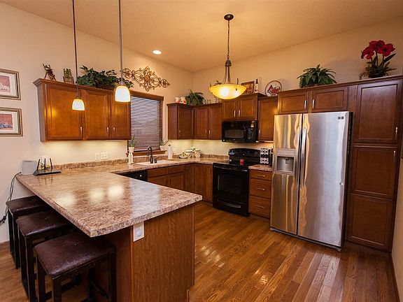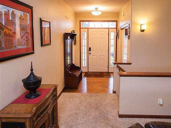 Step right in to this warm and inviting Quai Ridge home! You are welcomed in to this spacious 5 bedroom home with an inviting entry with wood floors that opens into the beautiful living room with corner gas fireplace. The spacious kitchen with wood floors opens to the dining area and living room. The master suite gives you the perfect spot to retreat to with a large bedroom, walk-in closet and master bathroom. 2 additional bedrooms and bathroom are on the main floor. The finished lower level is perfect for entertaining. Sit back and relax to watch a movie or big game on the big projection screen and enjoy the wet bar and rec area as well. 2 bedrooms and another bathroom complete the finished areas in the lower level. This wonderful home also features a spectacular fenced backyard with a deck overlooking it plus a large stamped concrete patio. Take advantage of the great basketball court in the backyard as well.