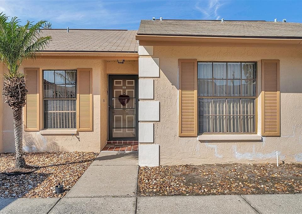 WELCOME TO YOUR AMAZING VILLA at 1815 Rising Sun Dr, Holiday, FL in the WONDERFUL community of Sunrise Square Villas. This single-story 2 bedroom, 2 bathroom with the LARGEST FLOOR PLAN is ready for the new owner to enjoy. Key exterior features are covered carport parking in front of the unit, TROPICAL landscaping including a palm tree & hedges with rock mulch, carriage light & covered front porch. The HOA is preparing all the buildings now for a FRESH COAT of exterior paint & the HOA replaced the roof in 5/2010. As you step inside, you'll LOVE the SOARING ceilings & NATURAL SUNSHINE streaming through the large windows ILLUMINATING the interior together with the BRIGHT light fixtures. The floors are dressed with FANTASTIC ceramic tiles or laminate throughout the villa for fluidity of design. The OPEN FLOOR PLAN consists of the foyer, kitchen, living, dining & Florida rooms. The CLEAN eat-in-kitchen has nice appliances, plentiful cabinets with hardware, tile backsplash, laminate counters & deep sink overlooking a pass-through window to the dining room. The combination living & dining rooms are MASSIVE so furniture can be arranged in a multitude of ways. The Florida room, which would make a perfect home office or reading nook, has a custom built-in bookshelves & storage closet with altted doors & exterior door to the backyard. The AMAZING primary bedroom can easily accommodate king-size furniture & has a generous walk-in closet (6'x5.5'). The primary bathroom features an EXPANSIVE laminate counter with storage & private toilet room with step-in shower. In this split bedroom plan, the second bedroom is located at the front of the home with the full guest bathroom nearby. The guest bathroom features a tub/shower combination. The washer & dryer are included in the sale. This villa is sold FURNISHED for INSTANT ENJOYMENT OF THE LUCKY NEW BUYERS! The community of Sunrise Square Villas is a cheery, active 55+ living with recreational activities like HEATED POOL, shuffleboard & outdoor kitchen/BBQ area. Included in the low HOA fee of $350/month is recreational activities, lawn care, pest control, roof, exterior painting & trash. This is a no pet community unless you have a service animal/comfort pet & no motorcycles or leasing allowed. Location is IDEAL near schools, beaches, medical plazas, shopping centers, restaurants, places of worship, airport & tourist attractions. MAKE THIS YOUR FUTURE HOME!