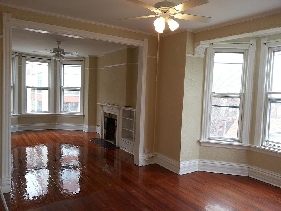 Top floor skyline views? Bright sunny top floor huge windows, hrdwf.In the heart of Roscoe Village Vintage delight. High ceilings. Available. July 1st. 2 triple bay windows. So much light! Dishwasher thermo windows. High ceilings fans in all rooms. 2 blocks Paulina L stop. Unique apt. Laundry in the basement. Fireplace. Large living Room and separate dining Room. Large Eat in kitchen and bathroom, with walk in pantry. Across from the Roscoe village of lofts. Redone kitchen and bathroom, Victorian brick 6 flat. End of June. Available One parking spot in back is available $45 a month.Apartment is for may 1st.Flexible move in dates,