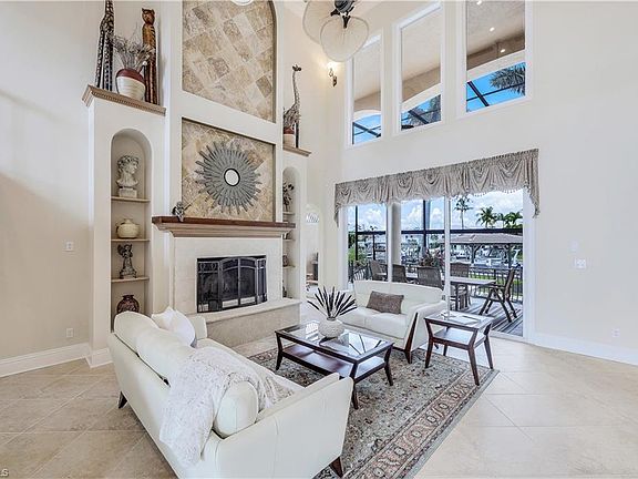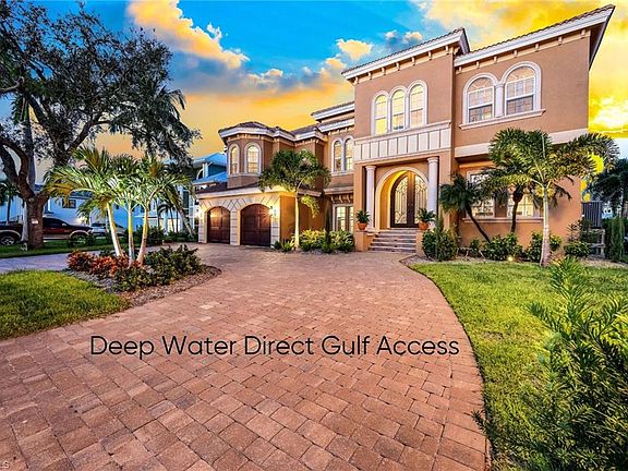Boating & fishing enthusiasts this deep water, direct gulf access luxury pool home, in the gated community of Old Pelican Bay, awaits you. Gulf waters, Mantanzas Pass, Sanibel & Fort Myers Beach are all a few minutes from your dock. Your dock & tiled-roof open boat house w/walk-around, electricity & water, has 1 covered slip (remote lift) & a 2nd slip uncovered. From the front foyer of the home, be engulfed by the living rooms 24' coffered ceiling, majestic wood-burning fireplace, graceful surrounding wrought-iron & wood balcony railings & direct views of your lanai, pool, spa, dock & canal. The home boasts 4 bedrooms, 4 full bathrooms, den, flex room w/walk-out balcony, gourmet kitchen w/new quartz counter tops, cooking island, new cabinetry & new polished SS appliances all positioned for efficiency & flow. The spacious primary bedroom suite w/walk-out balcony, 2 walk-in closets, large bathroom quarters w/dual sinks, separate tub & shower cater comfortably to its occupants. Plus, a new tile roof w/double-membrane, new pool cage screens & an over-sized 2-car garage w/polyurea floor. Sit back, relax & watch for an array of marine life as the day & evening slip away.