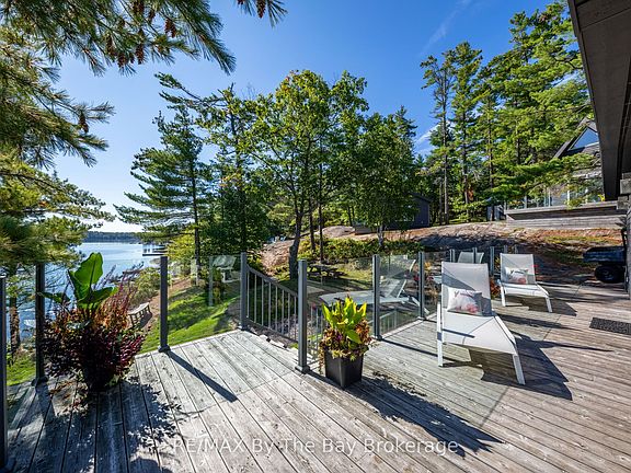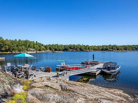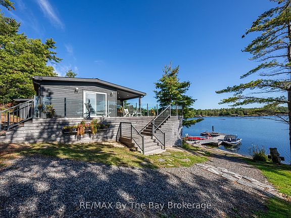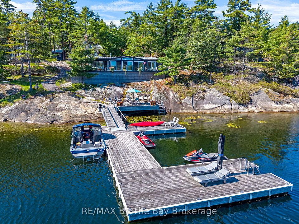 Set on 1.37 acres of picturesque land, this wonderfully designed private retreat features a charming 2-bedroom cottage perched on terra firma only steps from the lake, plus a 2-bedroom executive bunkie, both with their own laundry facilities. The property offers a unique blend of natural beauty, with dramatic granite outcroppings and lush, wooded terrain surrounding the home. Expansive glass railings enhance the breathtaking views of the calm shoreline, whether you're sipping your morning coffee or just watching the loons. Just 15 minutes from local marinas, this is the perfect location for boaters and nature lovers alike. The property is designed for relaxation and luxury, with an additional bunkie with a joint heat pump/AC unit, that is currently being used as a Pilates studio, creating the ideal space for wellness. For outdoor enjoyment, you'll find a custom fire pit area with granite flagstone, complete with authentic and handmade "Saturn" Fire pit and "Wings of Flight" log holder, as well as a massive, deep water, private dock and a spacious shoredeck perfect for entertaining or unwinding. Inside, the cozy corner propane fireplace adds warmth and ambiance to the cottage full of exquisite furniture, creating a perfect year-round retreat. Plenty of storage with a large storage shed and a tool shed, while peace of mind is provided with the built in Generac generator on an automatic switch for all buildings. The large, owned, propane tank supplies fuel for the 2 BBQ's, range cooktop and fireplace. With a mix of tranquility, peace of mind and easy access to local amenities, this stunning Georgian Bay property offers a rare opportunity to live the waterfront dream.