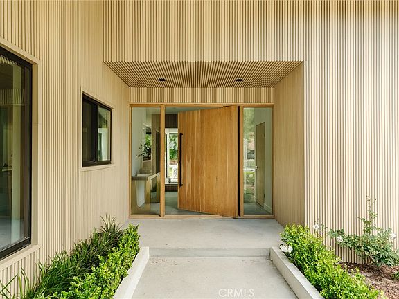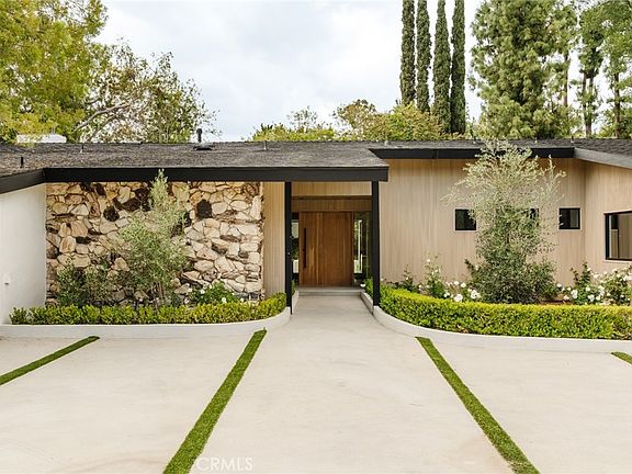 Presenting a completely reimagined single-story mid-century modern estate, privately gated in the prestigious Lake Encino community. Set on an expansive 18,031 sq ft lot, this thoughtfully redesigned residence offers 5 bedrooms, 4 bathrooms, and 4,503 square feet of living—all finished with premium materials and curated details. A custom white oak pivot door opens to a tranquil foyer, where a serene water feature is framed by floor-to-ceiling glass, setting a tone of understated luxury. The open-concept layout flows effortlessly, with designer fixtures, and clean architectural lines throughout. The family room features a sleek 3D fireplace and built-in bar, perfect for both entertaining and everyday living. The formal dining area connects seamlessly to the living space, all filled with natural light and designed to blend indoor and outdoor living. The chef’s kitchen is outfitted with custom cabinetry, quartz countertops, a large center island, and high-end appliances. The primary suite offers a luxurious retreat with a spa-inspired bath and generous closet space. Three additional bedrooms and two full bathrooms are positioned on the opposite side of the home, providing space and privacy for family and guests. Expansive sliding glass doors lead to a resort-style backyard with multiple lounge areas and a sparkling pool that retains its original mid-century shape. Located just moments from the chic shopping and dining destinations along Ventura Boulevard, offering the best of both serenity and convenience. This exceptional residence blends mid-century charm with modern sophistication in one of Encino’s most sought-after enclaves.