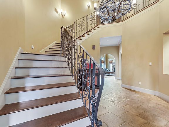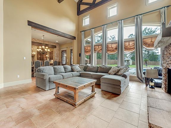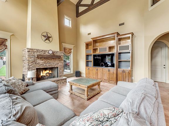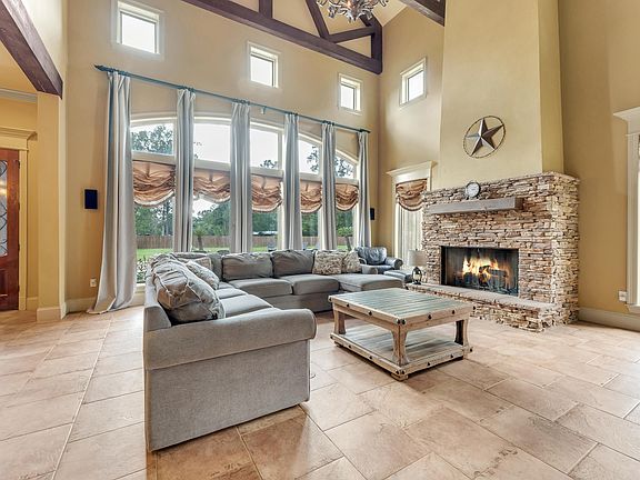 Step into Tuscan luxury with this magnificent 4bd, 5.5ba estate on almost 3 acres. As you arrive, the circular driveway elegantly wraps around a large fountain, setting the stage for an archway entry into this stunning home. Inside, you'll be captivated by the wrought iron stairway leading to the upper level, adorned with a large rustic chandelier that can be mechanically raised and lowered for easy bulb replacement and cleaning. The open floor plan features brick wall accents, exposed cypress beams, and hickory wood floors. The spacious living room boasts a wall of windows that flood the space with natural light, soaring ceilings, and custom handcrafted cast stone molding on the fireplace hearth and mantle wall. The kitchen is a chef’s dream with antique cypress cabinets, stainless steel appliances, a gas cooktop with pot filler, exotic granite island, and porcelain tile floors. A guest bedroom with its own full bath provides privacy and comfort for visitors. Upstairs, the Master suite is a true retreat with two large walk-in closets with built-in shelving and a spa-like ensuite bath featuring a double vanity, custom shower and an acrylic jetted air tub.. In addition, the upper level hosts two additional bedrooms, each with a separate bath and a common bonus space perfect for a homework/play room. A versatile second bonus room with a half bath, previously used as a media room, has access to the home automation system closet. Also on the upper level is a large office and ample attic storage space. Outside, enjoy a covered living area with a fireplace and outdoor kitchen overlooking a sparkling inground pool. The irrigation system ensures effortless lawn maintenance. Located in Flood Zone X, this home does not require flood insurance and has never flooded! Plus, with the ample Generac generator, you’ll never be without power. This Tuscan-inspired home offers unparalleled luxury, style, and functionality – a true gem in a serene setting.