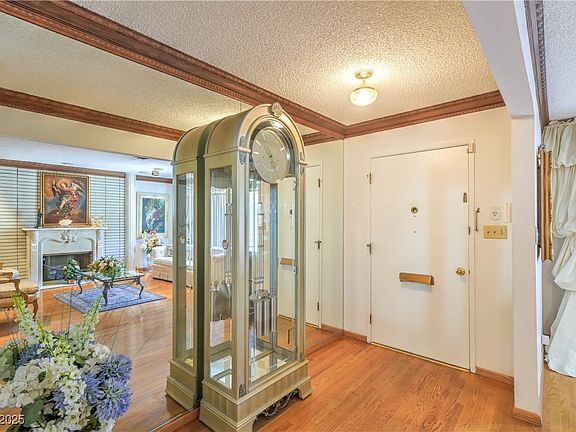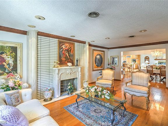 Step back in time with this vintage Las Vegas masterpiece, a rare single-story gem that blends mid-century character with modern comfort and endless charm. Nestled on a sprawling lot with a circular driveway, mature landscaping, covered carport, and gated recreational vehicle area, this home captures the essence of old-school Vegas luxury. Inside, custom woodwork, crown molding, hardwood floors, and recessed lighting highlight true craftsmanship. Entertain in style with a formal living and dining room, large wet bar with hidden passage to a butler’s kitchen, laundry, and bath, plus a chef’s kitchen with island, breakfast nook, and built-in appliances. The great room features vaulted ceilings, skylights, and a cozy fireplace, while the primary suite offers a sitting area and cedar-lined walk-in closet. Step outside to your private resort-style backyard with a detached guest house/casita featuring a kitchenette and bath, built-in BBQ, sparkling pool and spa, and ample storage.