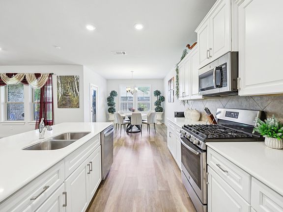 Welcome to this beautifully maintained 4-bedroom, 2.5-bath home in the highly sought-after Wellington community, located within acclaimed Northwest ISD. This expansive single-story layout offers flexibility and function with a formal front living area that can easily serve as a home office, flex space, or even an additional bedroom.Enjoy entertaining in the formal dining room and relax in the large open living area featuring a cozy fireplace and plenty of natural light from the oversized windows. The stunning kitchen boasts white cabinetry, quartz countertops, a gas range, and comes complete with both the kitchen and garage refrigerators.The spacious and private primary suite includes a large ensuite bath, while the secondary bedrooms offer plenty of room for everyone. Additional upgrades include gutters added in 2024 and the washer and dryer are also included.