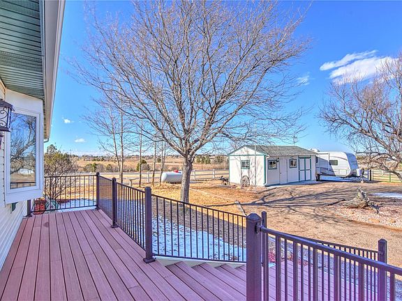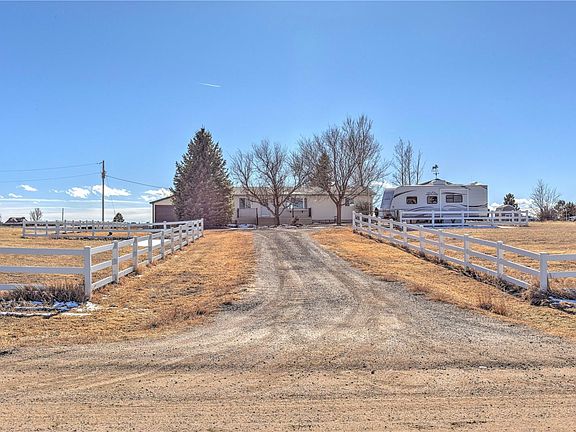 Immaculate ranch style home on 5 acres of fully-fenced horse property with mountain views! Large detached 3 car garage with horse barn, watering trough w/ designated waterline, loft and secure storage. Additional 24' x 14' workshop. Circular driveway. RV parking. This modular home on a permanent foundation has been updated inside and out with a new roof, vinyl siding, Milgard windows and newer furnace. Interior walls have been drywalled, textured and freshly painted. The kitchen has been updated with slab granite countertops, tile backsplash, 42" birch cabinets w/ under cabinet lighting, pull out drawers and SS appliances including 5 burner gas range, oven, microwave and refrigerator. Real hardwood floors on main level and master, laminate wood in 2 secondary bedrooms. The sunny greatroom boasts mountain views, a bay window and gas log stove for heating or ambiance. Enjoy Colorado sunsets from the front porch or large covered back deck w/ patio.