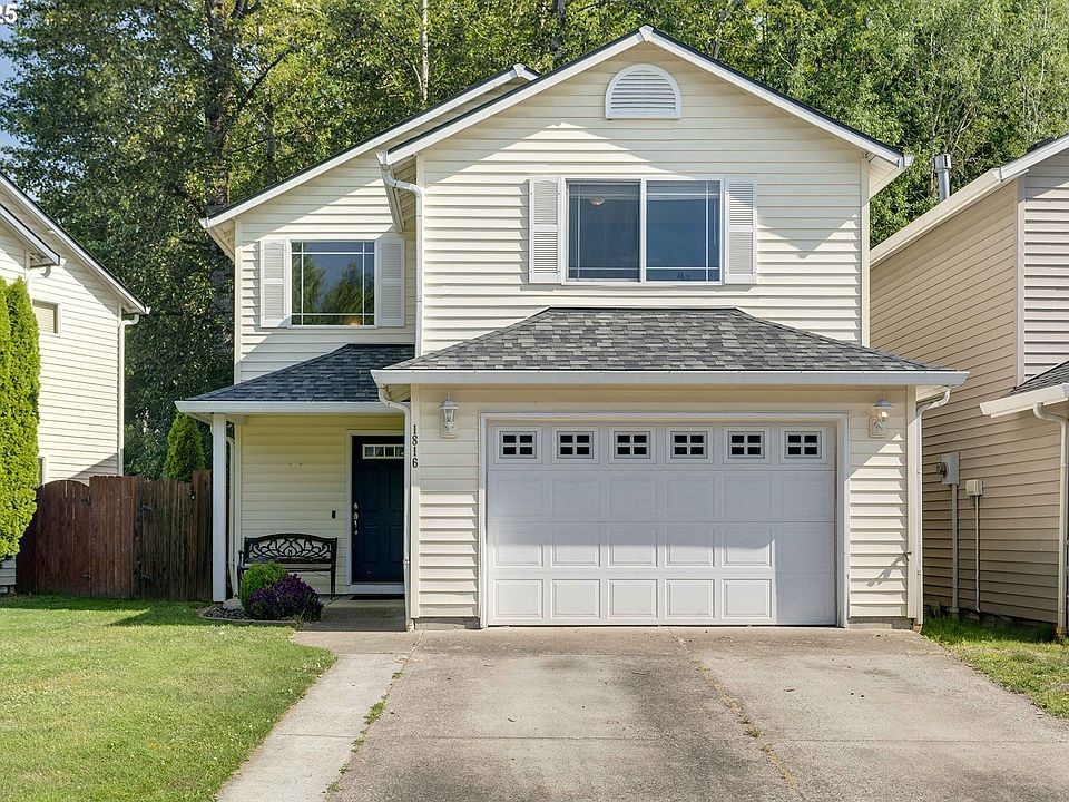 Welcome to 1816 SW 6th St – a spacious and well-designed 3-bedroom, 2.5-bath home located in a desirable Battle Ground neighborhood. Set on a fully fenced lot with a 2-car garage, this home offers both comfort and functionality. Step onto the covered front porch and into a welcoming foyer with vaulted ceilings. The open-concept main floor features a bright living area that flows into a dining space with double doors to the backyard, perfect for indoor outdoor living. The kitchen is equipped with stainless steel appliances, a pantry, and an eat-up bar, making it ideal for everyday cooking and entertaining. A convenient half bath and laundry room are located on the main level, while all three bedrooms are upstairs. The primary suite includes a walk-in closet and an attached bathroom for added privacy and comfort. Enjoy a low-maintenance backyard with plenty of room to garden, play, or relax. Located close to schools, parks, and shopping, this home combines small-town charm with everyday convenience.