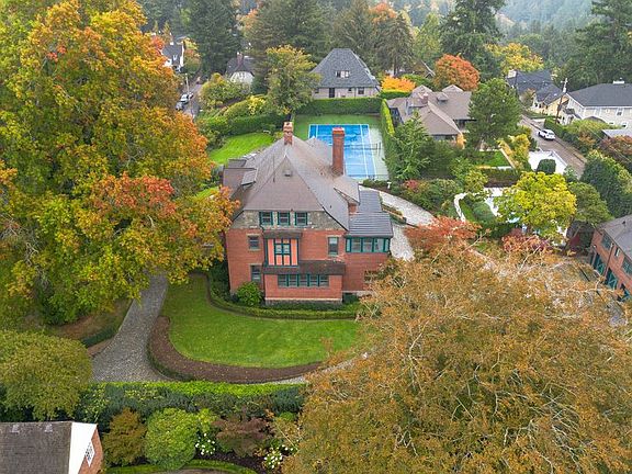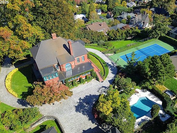 Nestled in Portland’s prestigious West Hills, this extraordinary estate offers sweeping views of the city skyline, Willamette River, and Cascade Mountains. Set on 1.17 acres of gated, park-like grounds, the property blends historic elegance with modern luxury.Originally built in 1887 by JJ McCaffrey and thoughtfully updated in 1928 by renowned architects Jacobberger and Smith, the residence showcases timeless craftsmanship and architectural distinction. The home has been exceptionally maintained over decades of ownership. Inside, experience approximately 10,000sf of living space that unfolds across four levels, featuring elaborate moldings, stained glass windows, rich wood floors, and multiple fireplaces. Grand formal rooms are complemented by a marble-clad chef’s kitchen with Thermador appliances, a butler’s pantry, and exquisite built-ins throughout.The upper-level grand ballroom represents architecture at its finest with maple wood floors, curved trusses, under-eave insulated storage, and finished with tongue and groove fir ceilings. The estate also includes two separate dwellings: a 2-bedroom, 1-bath guest house with fireplace and scenic views, and a 1-bedroom, 1-bath carriage house with full kitchen, office space, and a six-car garage. Outdoor amenities elevate the lifestyle with a full-size tennis court, in-ground pool surrounded by Italian porcelain patio, cobblestone driveway, and manicured gardens.Located minutes from NW 23rd, downtown Portland, top-rated schools including Ainsworth Elementary and Lincoln High, and major medical centers, this rare offering combines privacy, prestige, and convenience in one of the city’s most coveted settings. [Home Energy Score = 1. HES Report at https://rpt.greenbuildingregistry.com/hes/OR10226736]