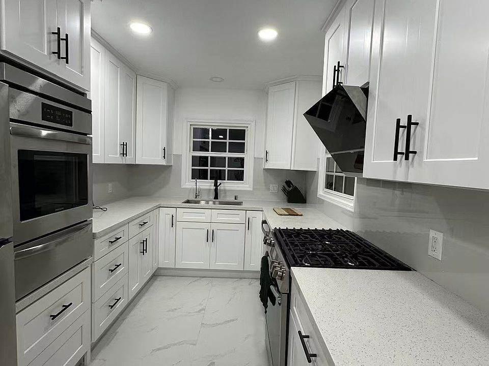 Modern kitchen with new cabinetry, countertops, and stainless-steel appliances.
