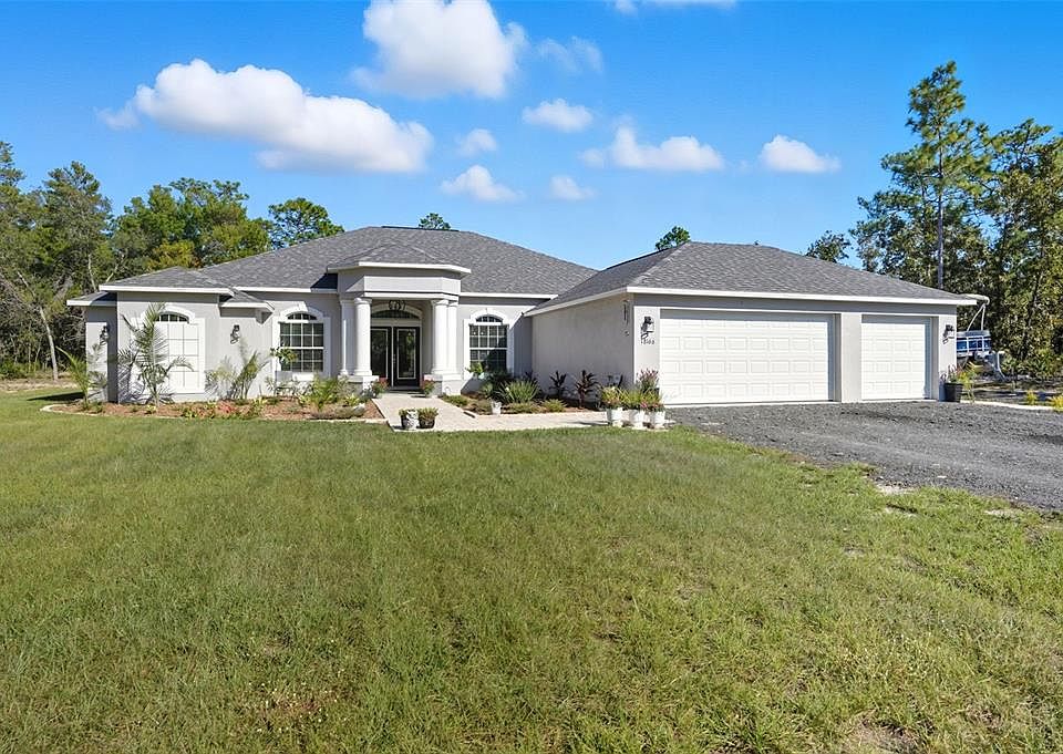 Welcome to this custom-built 4-bedroom, 3-bathroom home completed in 2023, offering 2,866 square feet of living space on a fully cleared 1.2-acre lot in Royal Highlands. With NO HOA, CDD fees, or Flood (located in Flood Zone X), this property provides the perfect balance of privacy, freedom, and modern convenience. Step inside to discover luxury vinyl flooring, tray ceilings, and an open-concept floor plan that seamlessly connects the formal living and family rooms—ideal for both everyday living and entertaining. The chef’s kitchen boasts granite countertops, high cabinetry, smart stainless steel appliances, and a large island with breakfast bar seating. The primary suite offers a private retreat with a sliding glass door to the lanai, a spacious walk-in closet, and a luxurious en suite bath featuring a dual-entry walk-in shower with a rain shower feature. A split-bedroom layout provides three additional bedrooms and two additional full baths, ensuring comfort and privacy for family or guests. Step outside to your covered and screened lanai, where you’ll enjoy peaceful wooded views, a dedicated fire pit area, and plenty of open space to create your own backyard oasis—whether it’s a pool, garden, workshop, or custom outdoor living area. The galley-style laundry room includes a utility sink and storage closet, adding to the home’s thoughtful functionality. Conveniently located near shopping, dining, schools, and medical facilities, with easy access to the Suncoast Parkway for a quick commute to Tampa and surrounding areas. Explore the best of the Nature Coast, from kayaking at Weeki Wachee Springs to fishing and scalloping along the Gulf. This home truly checks all the boxes—modern design, quality construction, a large cleared lot, prime location, and endless potential to build your dream oasis. Schedule your private tour today and experience the beauty of Royal Highlands living!
