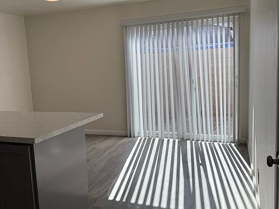 Private patioLaminated flooring and baseboardsQuartz countertopsDining roomWindow blindsRecessed lightingBack patio