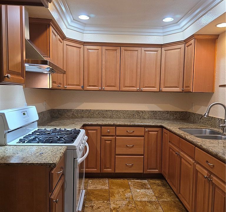Travertine tilesWood-look plank flooringSpacious unitCrown moldingsRecessed lightingU-shaped kitchen cabinetGranite kitchen countertop