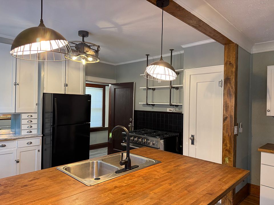 - Newly remodeled kitchen with open layout to dining area, featuring a spacious island and built-in dishwasher