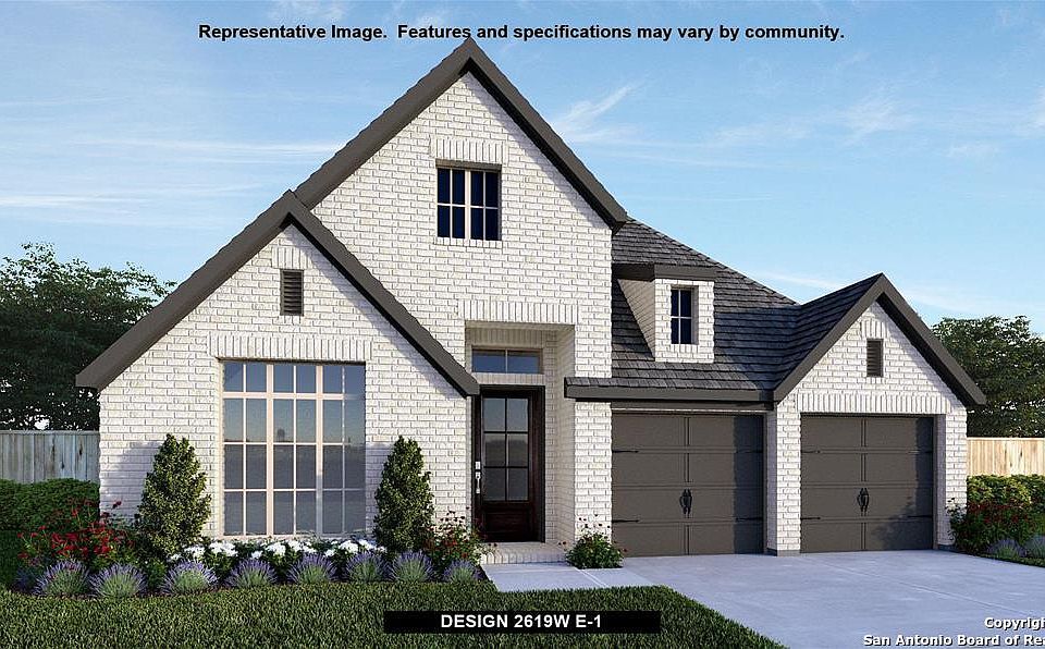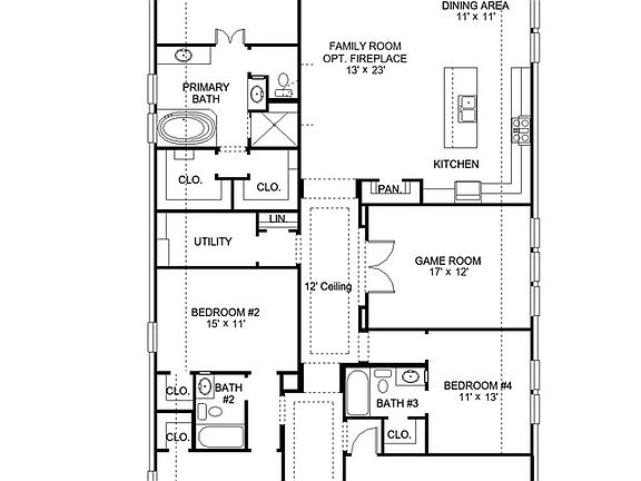 Welcoming front porch opens into an extended entryway adorned with 12-foot ceilings. French doors open into the private home office, located just off the entrance. Down the hallway, you will find the secondary bedrooms, each featuring walk-in closets and a shared full bathroom. Adjacent to the hallway, French doors open into the inviting game room, complete with three large windows. The open family room, featuring a wall of windows, seamlessly leads into the designated dining area. The corner kitchen boasts an inviting island with built-in seating, 5-burner gas cooktop and a walk-in pantry. Entering the primary bedroom, you are greeted with ample natural light from the three large windows. French doors lead into the primary suite, showcasing dual vanities, a garden tub, a glass enclosed shower, and two walk-in closets. A guest suite with a walk-in closet and private full bathroom is located off the main hallway. The utility room with an included linen closet is conveniently located adjacent to the game room. Outside includes an extended covered backyard patio. Completing the home is a two-car garage.